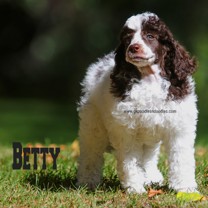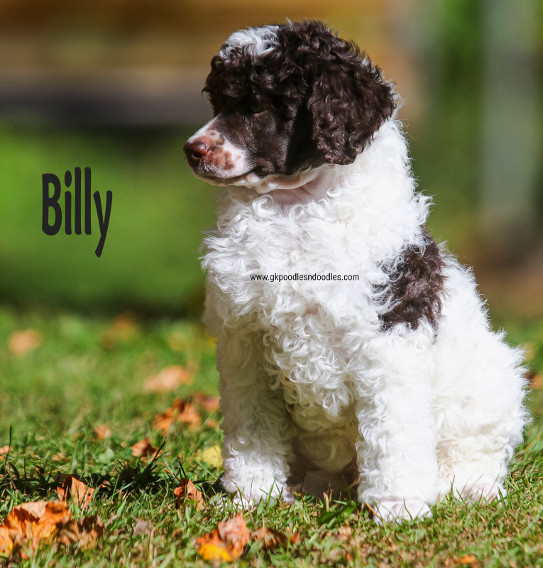 Ruby and River blessed us with 4 Moyen Poodle puppies tom August 4th. They gave us 1 black and white boy and 1 brown and white boy and 2 brown and white girls.